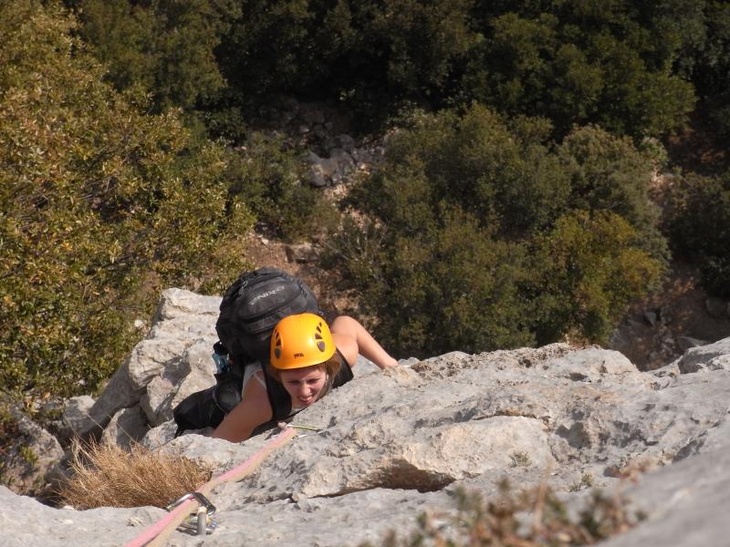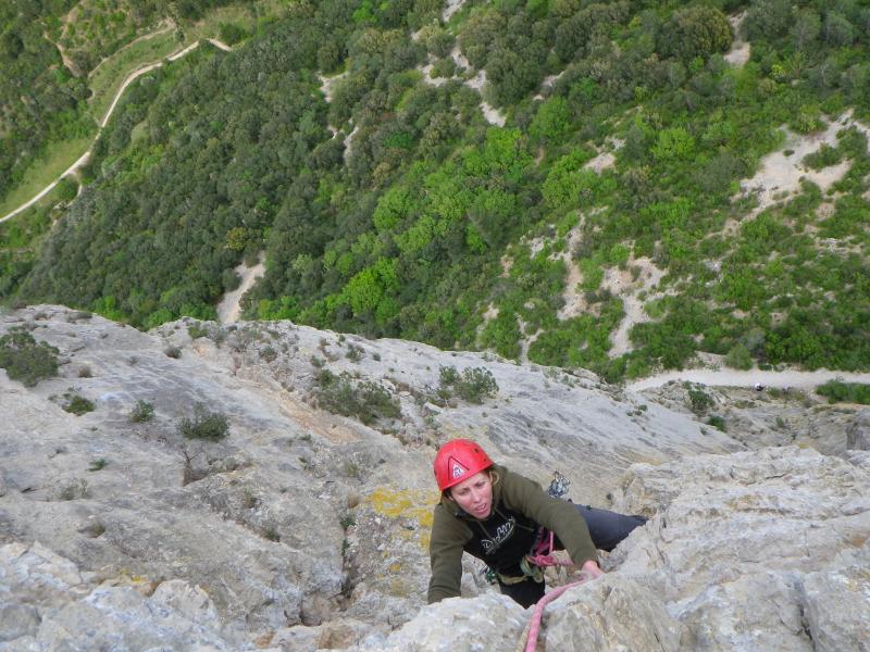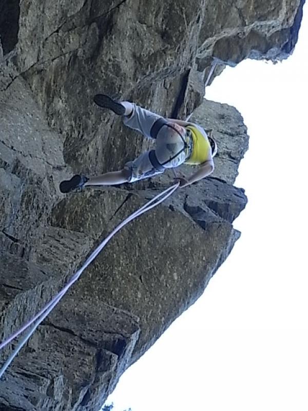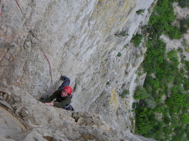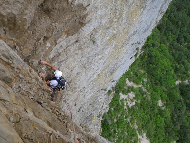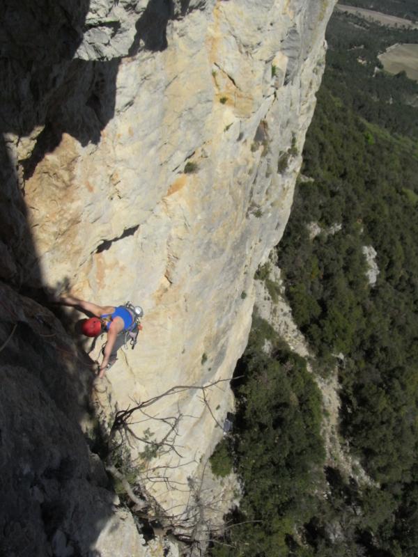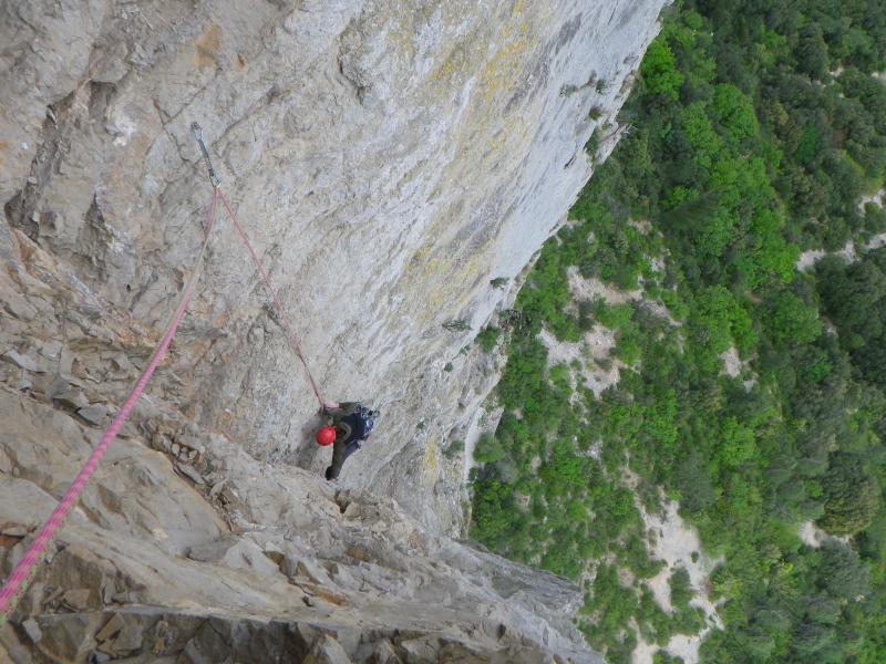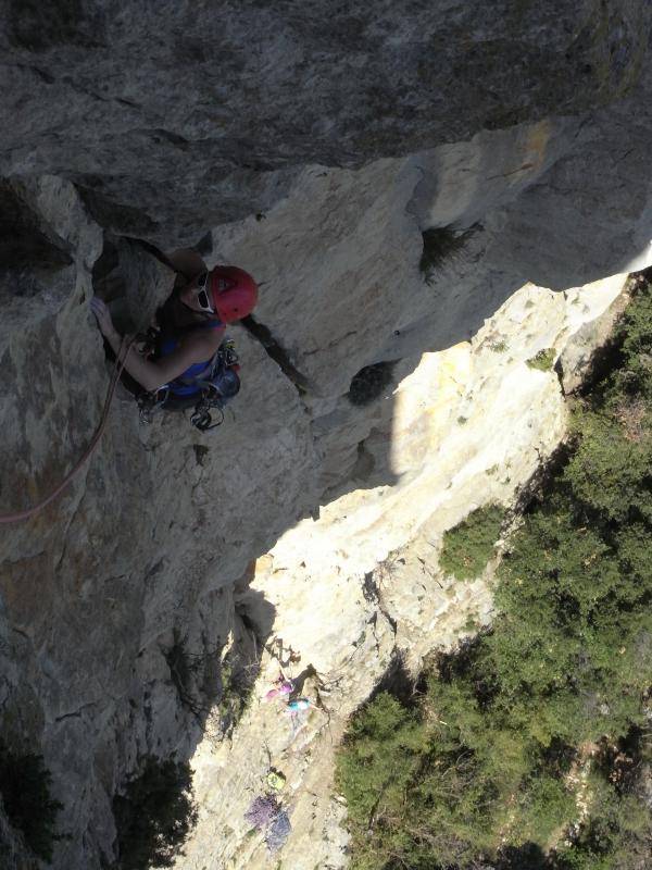 Les 3 premières longueurs sont déversantes, puis la paroi se redresse un peu sur la fin.